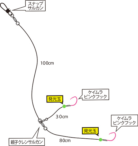 ■針はヒネリがないムツ針を使用、カラーは紫外線で青白く光るケイムラピンクカラー