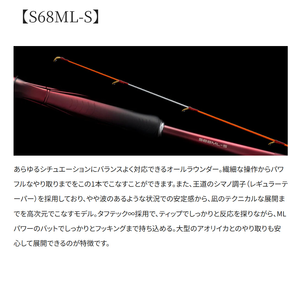 ティップエギングにおける理想を一本に凝縮したモデル。それが「S68ML-S」です。 6フィート8インチという長さは、船の揺れを吸収するストロークを持ちながら、取り回しも抜群。 そしてML(ミディアムライト)パワーは、30m以深の深場や潮流の速いエリアでもエギの重さに負けず、キレのあるダートアクションを演出できます。
